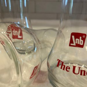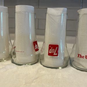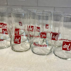 Each glass features the classic 7-Up logo and the famous slogan “The Uncola,” creating a delightful conversation piece for any gathering or a unique addition to your collection. The upside-down design adds a whimsical touch that showcases the innovative marketing of that era.