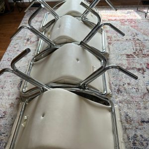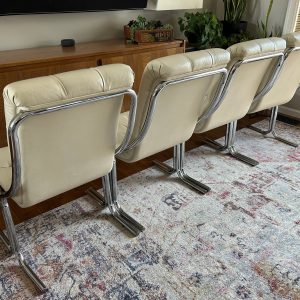 These chairs are in very good vintage condition. No smoke or strange smells. The chair structure and padding is in great condition. The chrome is in great vintage condition. Upholstery is a beautiful creamy white and it is original.