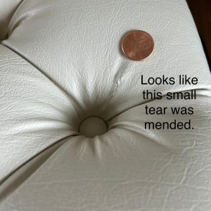 Photos show small imperfections that have been present for decades and seem to not be going anywhere! Mostly, if any, around the tufted buttons. This upholstery is very durable and still has decades left to go. I tried to show any imperfections in photos. If you would like more photos or a video please let me know. I am happy to help with any questions.