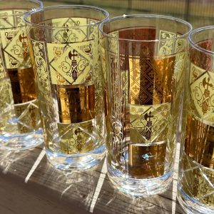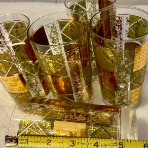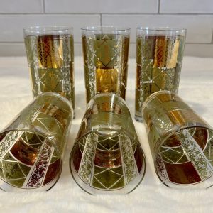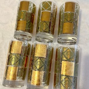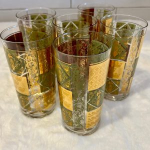 Vintage Mid-Century Modern Highball Green & 22K Gold Royal Banner Barware: These are unmarked, but are Hollywood Regency (Culver/Briard) in style.