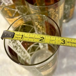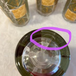 CONDITION: 5 glasses are in great vintage condition. No nicks, chips. Gold and green areas are in very good condition. 1 glass as shown in photo has a small hairline crack. It is on the bottom of the thick glass. It doesn’t appear to be inside. These glasses look like they were very rarely used. GORGEOUS!