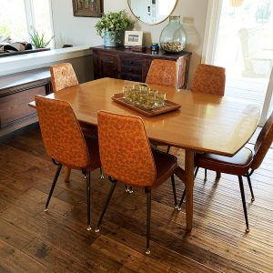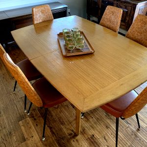 Comes with 2 leaves, each 16” x 44.5.” Also has table pad and pads for leaves as well. When the table is fully extended it is 96”x 44.5” This table is in beautiful vintage condition. $400 for just table and leaves. The 6 chairs are vintage Chromcraft chairs. $120 for all 6. They are in great condition as well. No tears or mars in the vinyl. I have included a lot of pictures for you to view. Asking $650 for all. Will separate for prices listed. Will deliver for fee. Need to sell for space.