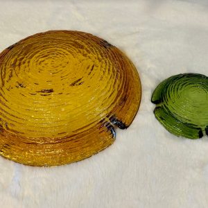 Anchor Hocking set of Soreno large Amber and small Avocado Green Ashtrays.