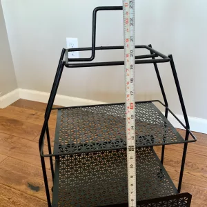 Keywords: Vintage magazine stand, smoking stand, retro MCM tiered stand, metal mesh magazine rack, plant stand, black stand, Atomic era design, mid-century modern style, quatrefoil metal design, versatile piece, home decor, convenient storage, tiered design, decorative accent, durable craftsmanship, sophisticated charm.