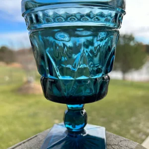Elevate your table setting with this stunning set of Vintage Park Lane Blue Water Goblets by Colony. Perfect for special occasions such as holiday tables and boho weddings, these goblets exude timeless elegance and add a touch of vintage charm to any gathering.